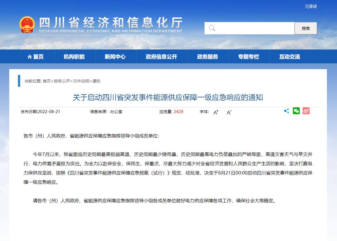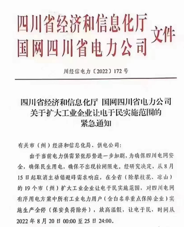 近期,因極端高溫天氣等原因,四川工業(yè)企業(yè)“臨時(shí)限電通產(chǎn)”引發(fā)行業(yè)高度重視。此前,相關(guān)部門下發(fā)通知,將限電停電期定為8月15日至20日。不過由于高溫天氣并未得到明顯好轉(zhuǎn),電力供需緊張形勢(shì)進(jìn)一步加劇,8月20日四川經(jīng)信廳、國(guó)網(wǎng)四川電力公司發(fā)布的一份《關(guān)于擴(kuò)大工業(yè)企業(yè)讓電于民實(shí)施范圍的緊急通知》,將限電期限延長(zhǎng)至25日,使得限電總時(shí)長(zhǎng)延長(zhǎng)到11天.