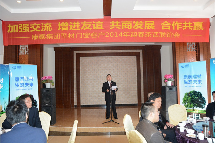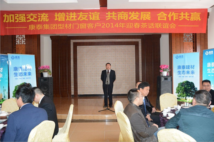 ??? 緊接著,由陳總作本次會議的主題發(fā)言,向客戶們介紹起了公司的型材營銷合作策略,陳總首先向林總裁以及出席會議的各位客戶匯報了2013年康泰型材取得的斐然業(yè)績,對2014年的工作進行了展望,陳總說道:“在公司領導和在座的客戶朋友的大力支持和協(xié)助下,在集團公司和各個中心的全力配合和幫助下,型材事業(yè)部在2013年取得了較好的發(fā)展。2013年超額完成計劃任務,達成率為118.12%,比2012年增長48.11%?!标惪偨又到y(tǒng)全面的介紹了型材事業(yè)部2014年的品牌戰(zhàn)略和質量戰(zhàn)略,并且向所有客戶朋友鄭重承諾:“我們所有的型材生產(chǎn)配方中沒添加一點回收料!”