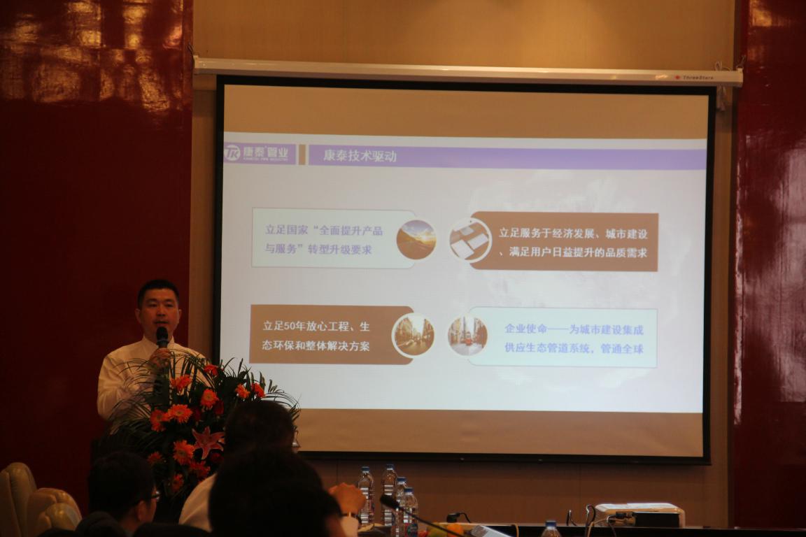 接著,康泰集團技術(shù)總監(jiān)張雙全向在場嘉賓介紹了康泰集團的新產(chǎn)品體系,重點介紹了康泰MPP單壁波紋管道系統(tǒng)、環(huán)保雨、污水用MPVE?雙壁波紋管道系統(tǒng)等產(chǎn)品。參會嘉賓認真聽取了公司的產(chǎn)品介紹,對康泰新產(chǎn)品的物理性能、產(chǎn)品質(zhì)量和化學配方等方面給予了高度評價。